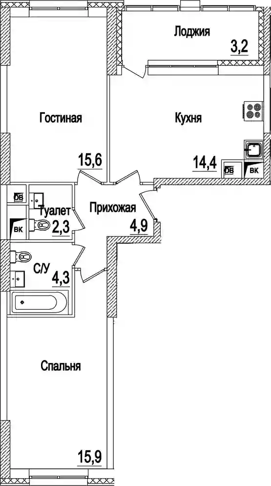 2-к.квартира, 57.4 м², 15 эт. в ЖК Рассказово Корпус 15.2