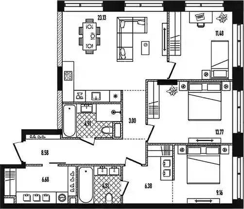 В комплексе предложен широкий выбор планировочных решений от компактных студий площадью 28 кв. метров до просторных пентхаусов с каминами площадью до 156 кв. метров. Также представлены редкие форматы квартир: с террасой, мастер-спальней и окном в ванной комнате. Уникальность проекта заключается в разнообразии типов остекления: в наличии 48 вариантов, включая джабо-окна, французские балконы и эркеры. Высота потолков составляет 3,1 метра, а в пентхаусах достигает 3,6 метра.