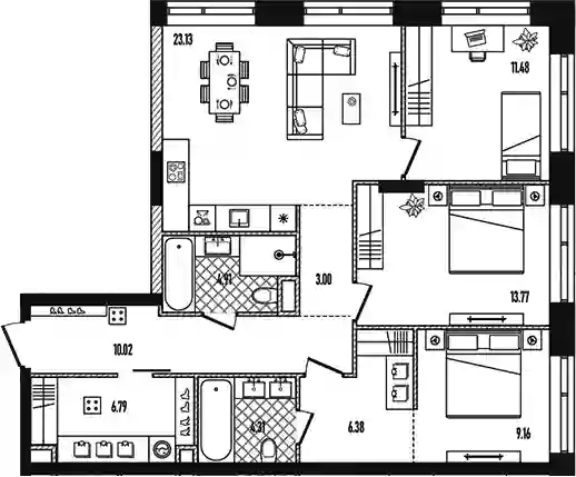 В комплексе предложен широкий выбор планировочных решений от компактных студий площадью 28 кв. метров до просторных пентхаусов с каминами площадью до 156 кв. метров. Также представлены редкие форматы квартир: с террасой, мастер-спальней и окном в ванной комнате. Уникальность проекта заключается в разнообразии типов остекления: в наличии 48 вариантов, включая джабо-окна, французские балконы и эркеры. Высота потолков составляет 3,1 метра, а в пентхаусах достигает 3,6 метра.