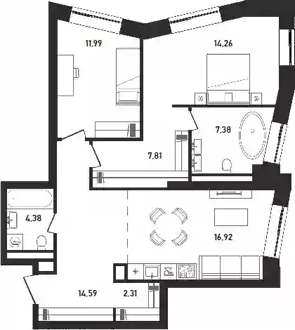 В комплексе предложен широкий выбор планировочных решений от компактных студий площадью 28 кв. метров до просторных пентхаусов с каминами площадью до 156 кв. метров. Также представлены редкие форматы квартир: с террасой, мастер-спальней и окном в ванной комнате. Уникальность проекта заключается в разнообразии типов остекления: в наличии 48 вариантов, включая джабо-окна, французские балконы и эркеры. Высота потолков составляет 3,1 метра, а в пентхаусах достигает 3,6 метра.