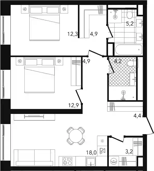 В комплексе предложен широкий выбор планировочных решений от компактных студий площадью 28 кв. метров до просторных пентхаусов с каминами площадью до 156 кв. метров. Также представлены редкие форматы квартир: с террасой, мастер-спальней и окном в ванной комнате. Уникальность проекта заключается в разнообразии типов остекления: в наличии 48 вариантов, включая джабо-окна, французские балконы и эркеры. Высота потолков составляет 3,1 метра, а в пентхаусах достигает 3,6 метра.