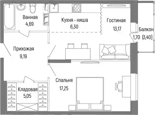 9 614 582 ₽1-к.квартира, 42.91 м², 5 эт.