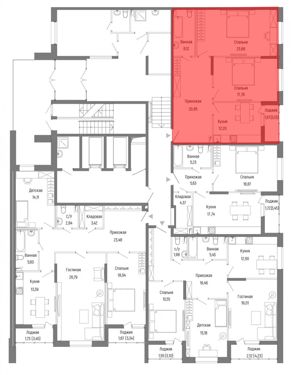 В комплексе представлен широкий выбор разнообразных планировок: от компактных студий до пятикомнатных квартир европейского формата. Есть планировки с гардеробными и несколькими санузлами. Все квартиры имеют застекленные балконы или лоджии. Квартиры сдаются в различных вариантах: с базовой подчистовой отделкой white box и без отделки с трассировкой стен.