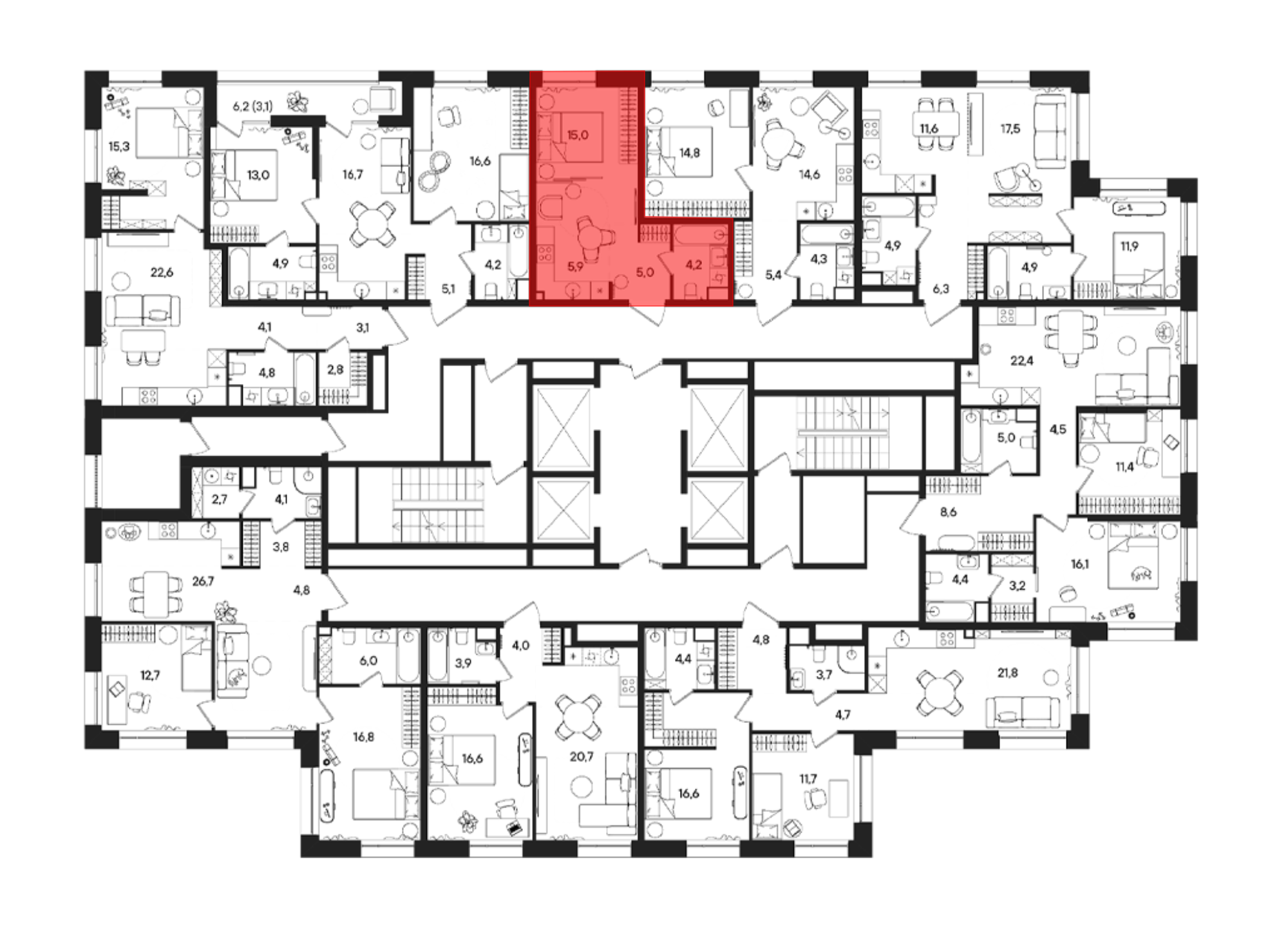 В жилом комплексе представлены планировки как классического формата, так и уникальные лоты: двухуровневые квартиры, просторные угловые кухни-столовые, планировки с мастер-спальней, студии с балконами и квартиры с террасами. Есть планировки, в которых предусмотрено окно в ванной комнате. А также видовые квартиры с видами на парк «Зеленая река» и Москва-Сити. Все квартиры сдаются без отделки, с высокими потолками от 3 метров и увеличенными окнами.