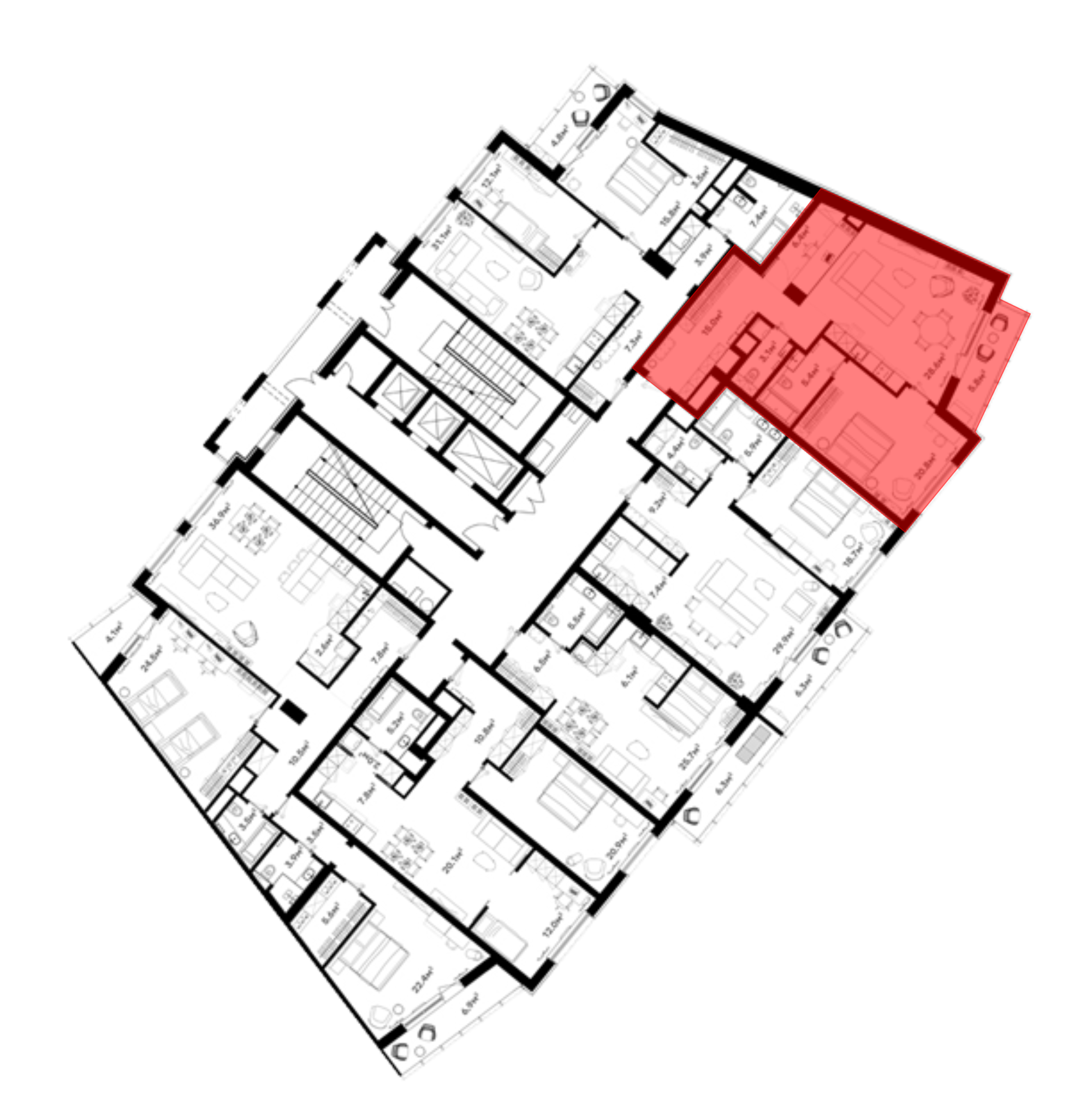 В проекте представлены квартиры площадью от 44 до 183 кв. м с высокими потолками и свободной планировкой. Доступны 3 формата отделки: без отделки, предчистовая (white box) и чистовая. В предчистовом варианте выполнены стяжка, штукатурка, перегородки, разводка электрики и инженерные системы. В чистовой отделке — финишные покрытия, двери, сантехника, осветительные приборы. На верхнем этаже расположены 8 пентхаусов с террасами на крыше и площадью от 282 кв. м.