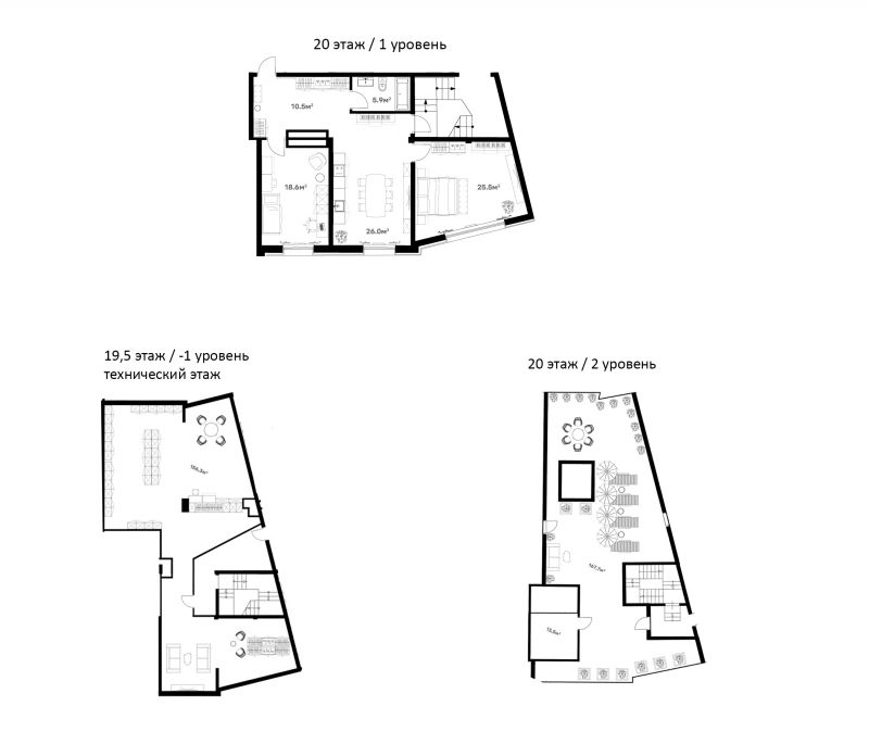 В проекте представлены квартиры площадью от 44 до 183 кв. м с высокими потолками и свободной планировкой. Доступны 3 формата отделки: без отделки, предчистовая (white box) и чистовая. В предчистовом варианте выполнены стяжка, штукатурка, перегородки, разводка электрики и инженерные системы. В чистовой отделке — финишные покрытия, двери, сантехника, осветительные приборы. На верхнем этаже расположены 8 пентхаусов с террасами на крыше и площадью от 282 кв. м.