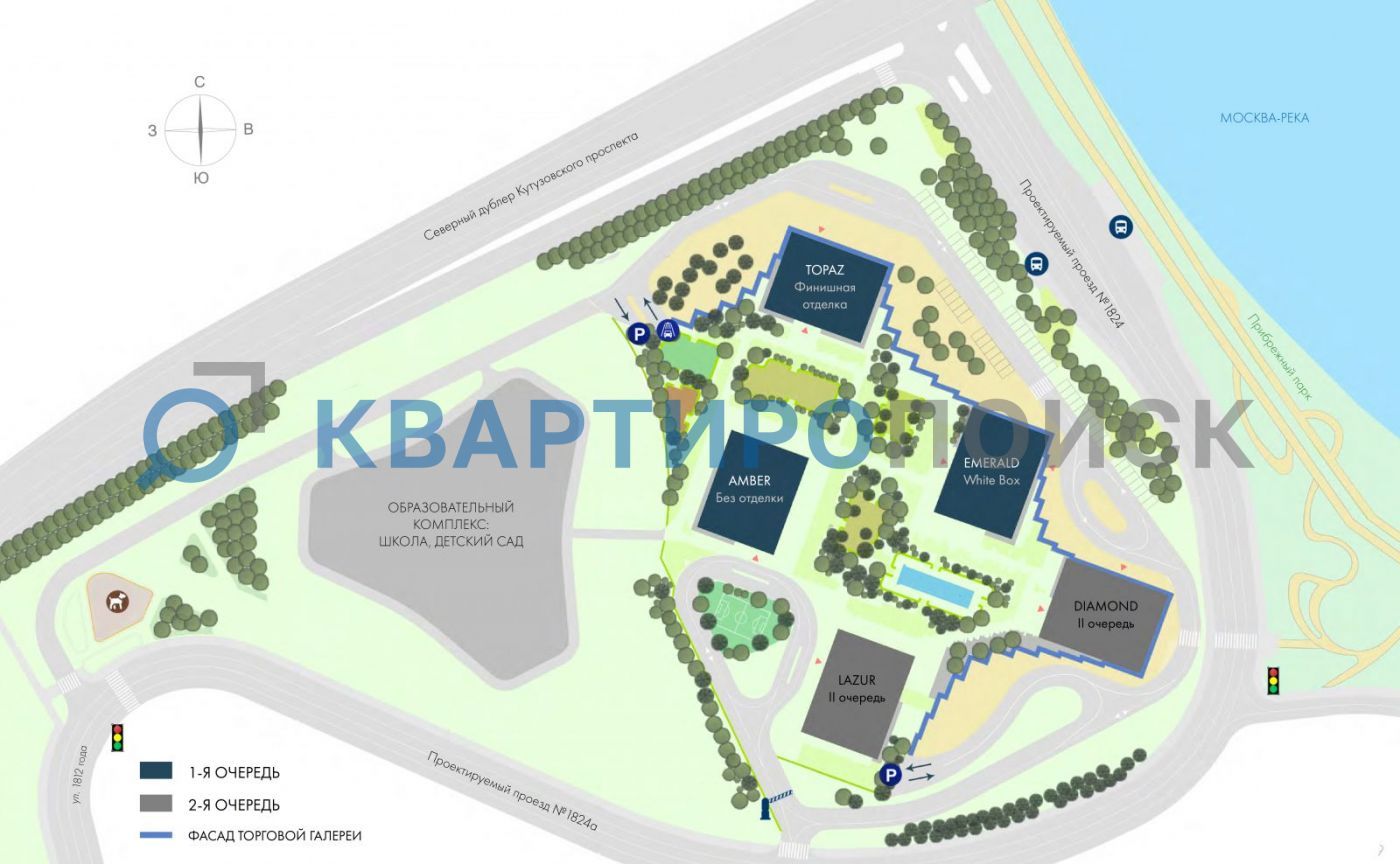 Дворы закрыты от автомобилей и случайных прохожих. Для автовладельцев предусмотрен подземный паркинг на 710 мест. Территория комплекса благоустроена: собственная набережная, прогулочная зона, зеленый двор. На первых этажах зданий разместятся кафе, салон красоты, аптека, магазины.