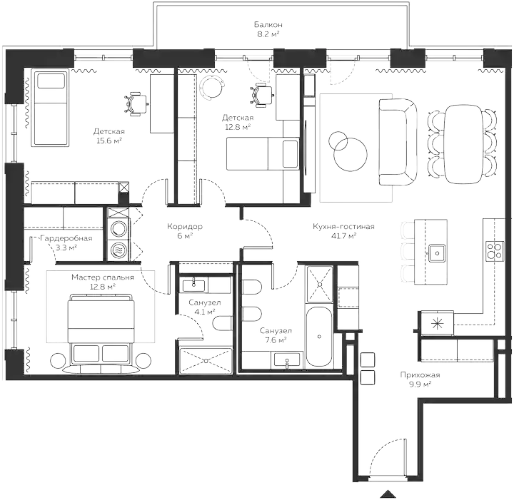 В проекте предусмотрено 3 типа резиденций: просторные апартаменты, таунхаусы и виллы. Из окон открывается вид на парк и Москва-реку. Резиденции сдаются без отделки, высотой потолков от 3,1 до 3,3 метра и панорамными окнами. Для таунхаусов и апартаментов на первом этаже предусмотрены террасы с видом на реку и во внутренний двор.