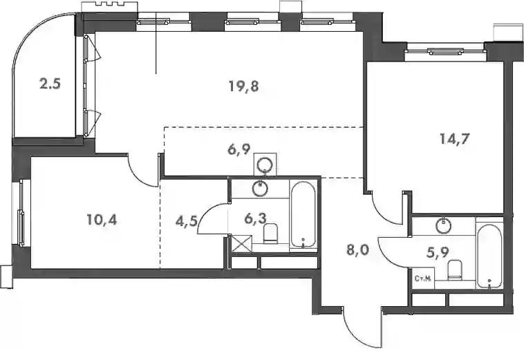 В комплексе предложен широкий выбор планировочных решений от студий до 5-ти комнатных квартир. Также доступны уникальные форматы: квартиры с панорамными гостиными и террасами. Все квартиры сдаются без стен, что открывает возможности для индивидуального оформления. Высота потолков составляет 2,8 метра, а окна — панорамные и увеличенные.