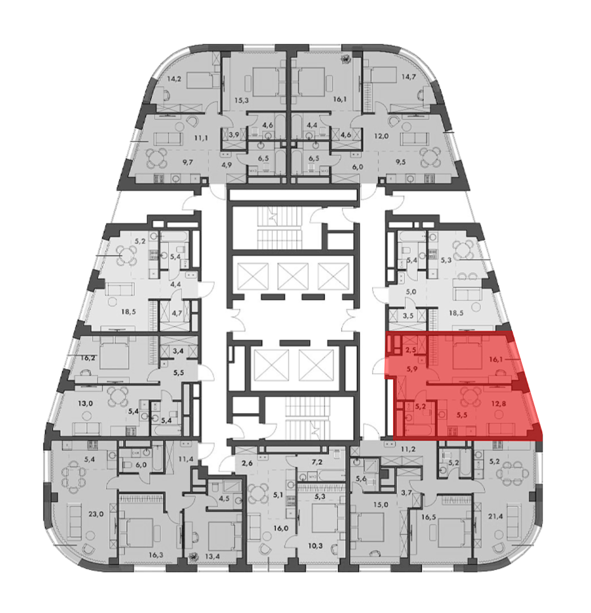 Спроектировано 715 квартир, которые сдаются без отделки. На выбор покупателя представлены разнообразные планировки: от студий до видовых пентхаусов на последних этажах с собственными террасами. Возможно объединение нескольких квартир в одну. Высота потолков варьируется от 3 до 4,2 м. Все квартиры имеют панорамное остекление.