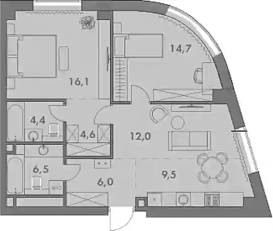 В комплексе предложен широкий выбор планировочных решений от студий до 5-ти комнатных квартир. Также доступны уникальные форматы: квартиры с панорамными гостиными и террасами. Все квартиры сдаются без стен, что открывает возможности для индивидуального оформления. Высота потолков составляет 2,8 метра, а окна — панорамные и увеличенные.