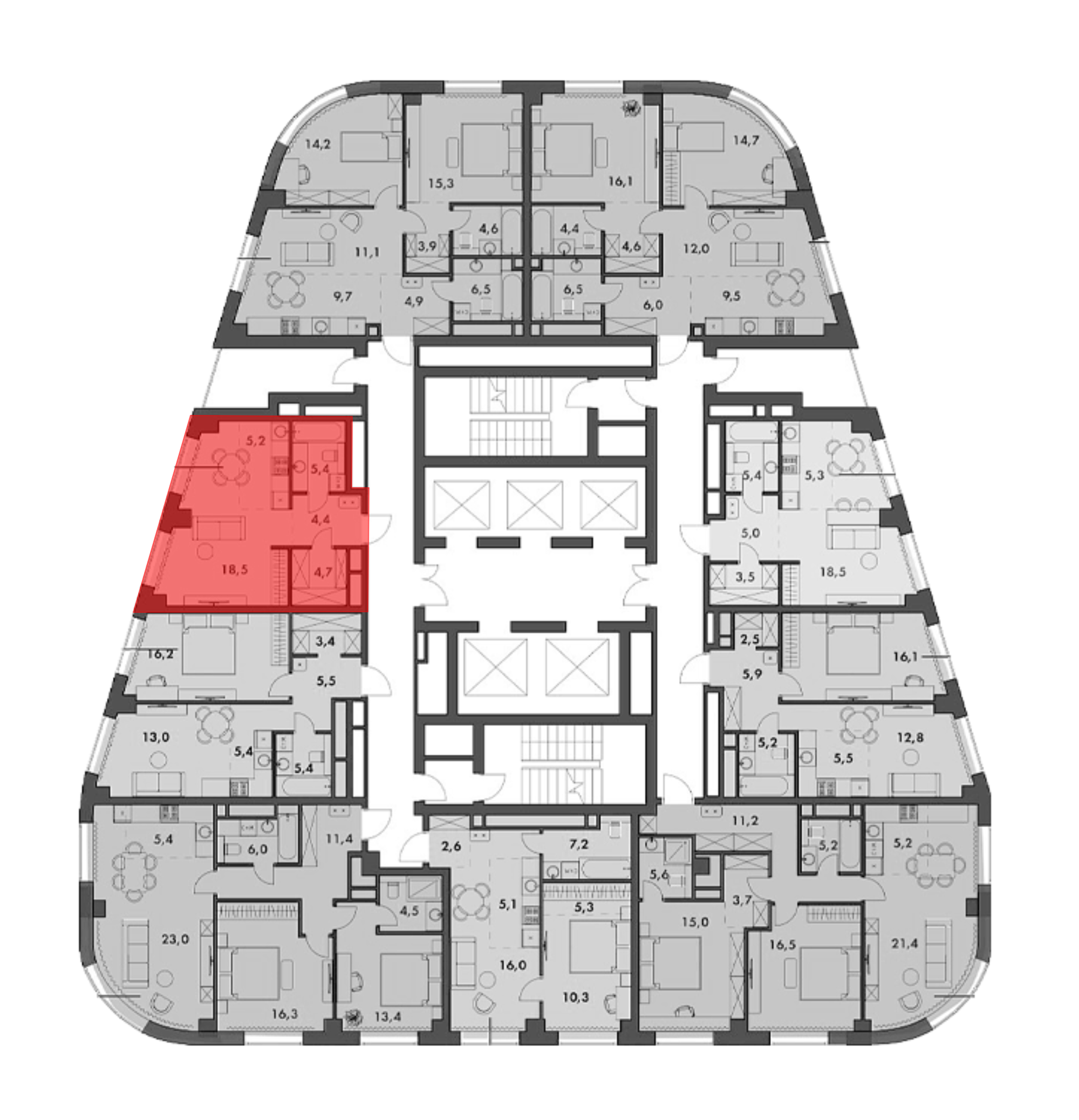 В комплексе предложен широкий выбор планировочных решений от студий до 5-ти комнатных квартир. Также доступны уникальные форматы: квартиры с панорамными гостиными и террасами. Все квартиры сдаются без стен, что открывает возможности для индивидуального оформления. Высота потолков составляет 2,8 метра, а окна — панорамные и увеличенные.