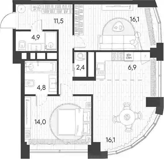 В комплексе предложен широкий выбор планировочных решений от студий до 5-ти комнатных квартир. Также доступны уникальные форматы: квартиры с панорамными гостиными и террасами. Все квартиры сдаются без стен, что открывает возможности для индивидуального оформления. Высота потолков составляет 2,8 метра, а окна — панорамные и увеличенные.