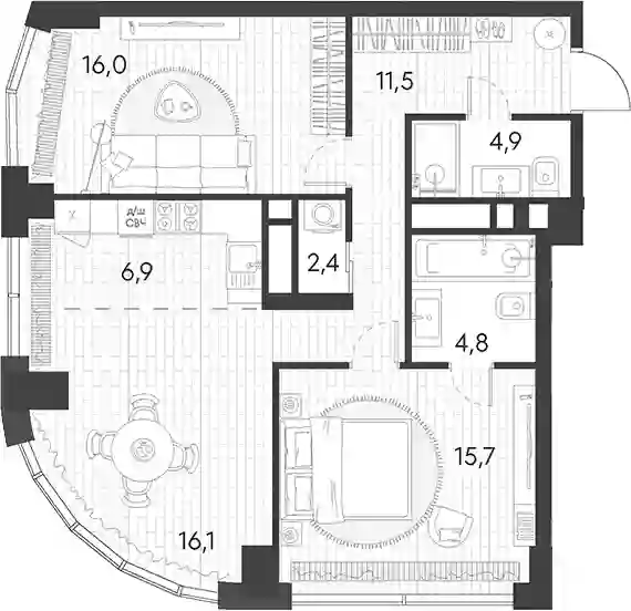 В комплексе предложен широкий выбор планировочных решений от студий до 5-ти комнатных квартир. Также доступны уникальные форматы: квартиры с панорамными гостиными и террасами. Все квартиры сдаются без стен, что открывает возможности для индивидуального оформления. Высота потолков составляет 2,8 метра, а окна — панорамные и увеличенные.