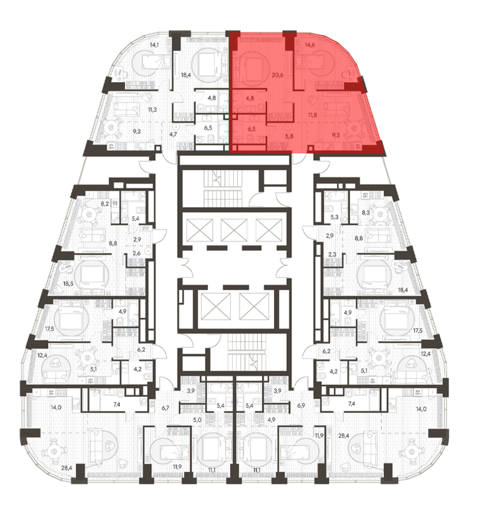 В комплексе предложен широкий выбор планировочных решений от студий до 5-ти комнатных квартир. Также доступны уникальные форматы: квартиры с панорамными гостиными и террасами. Все квартиры сдаются без стен, что открывает возможности для индивидуального оформления. Высота потолков составляет 2,8 метра, а окна — панорамные и увеличенные.