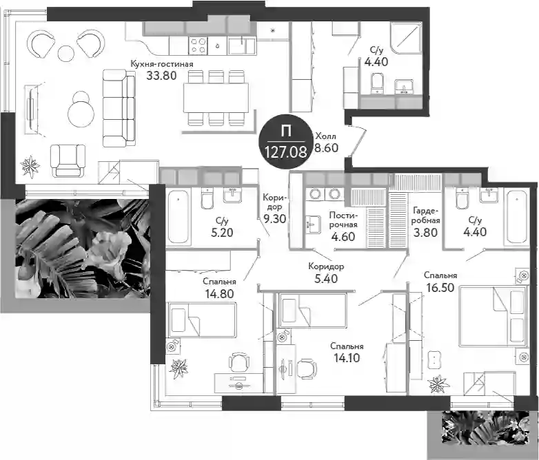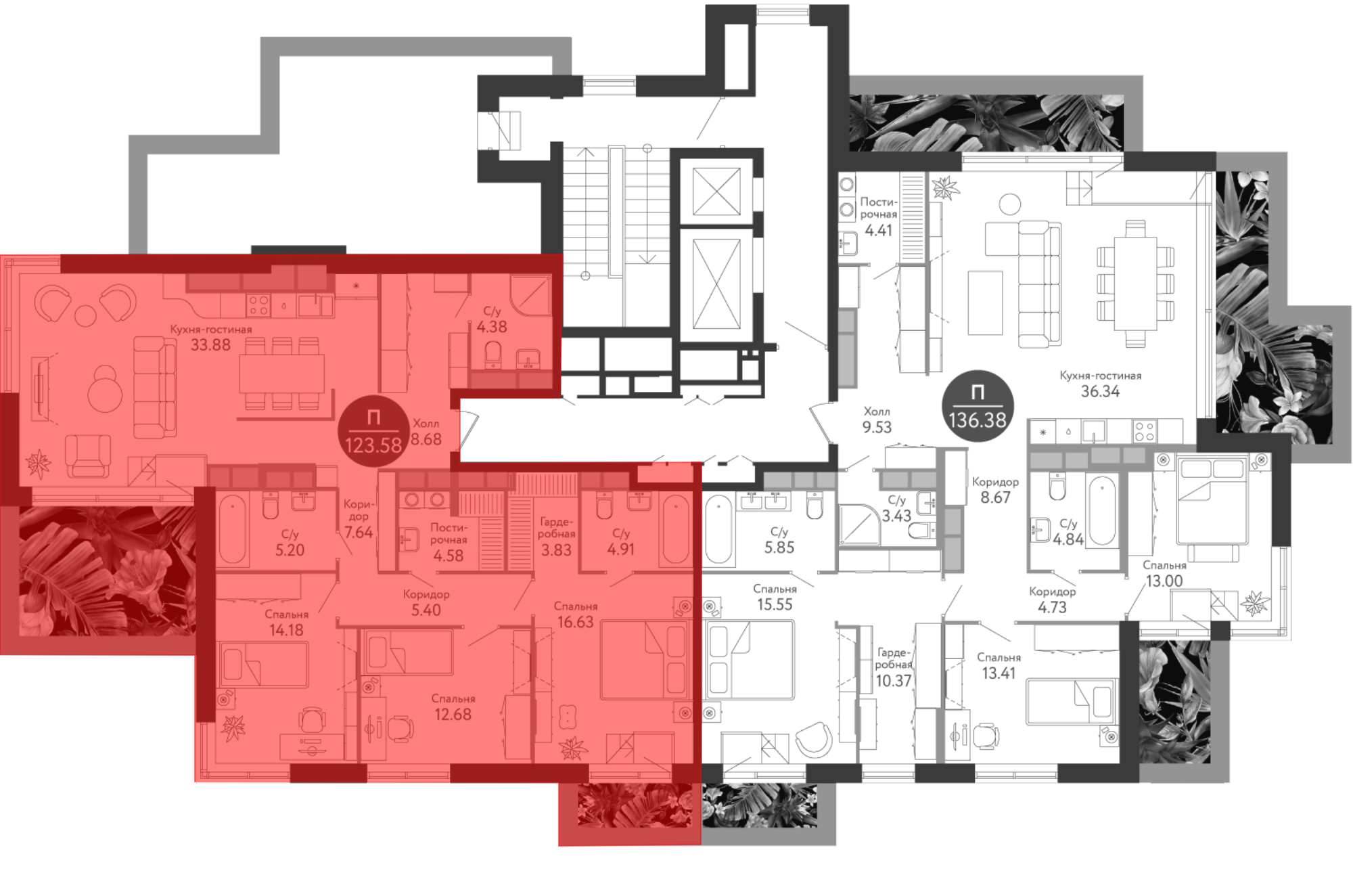 Спроектировано 715 квартир, которые сдаются без отделки. На выбор покупателя представлены разнообразные планировки: от студий до видовых пентхаусов на последних этажах с собственными террасами. Возможно объединение нескольких квартир в одну. Высота потолков варьируется от 3 до 4,2 м. Все квартиры имеют панорамное остекление.