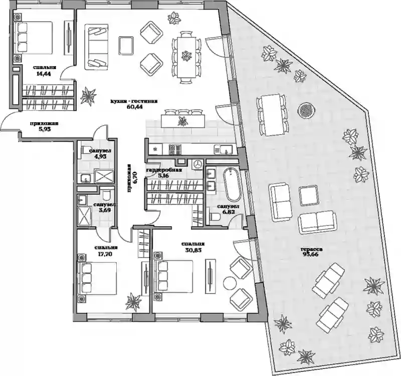 В комплексе предусмотрено множество планировок: квартиры с 1–3 спальнями, резиденции с патио, пентхаусы с террасами и уникальные урбан-виллы. Окна и террасы резиденций обращены либо на набережную, либо на приватный сад. Сдаются квартиры с панорамными окнами и высотой потолков до 3,9 метра.
