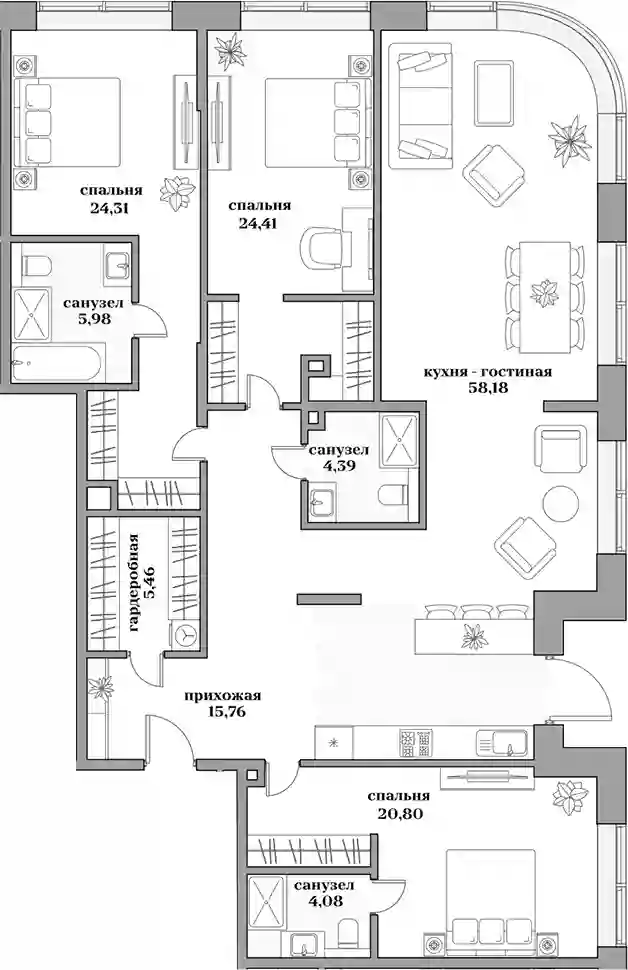 В комплексе предусмотрено множество планировок: квартиры с 1–3 спальнями, резиденции с патио, пентхаусы с террасами и уникальные урбан-виллы. Окна и террасы резиденций обращены либо на набережную, либо на приватный сад. Сдаются квартиры с панорамными окнами и высотой потолков до 3,9 метра.