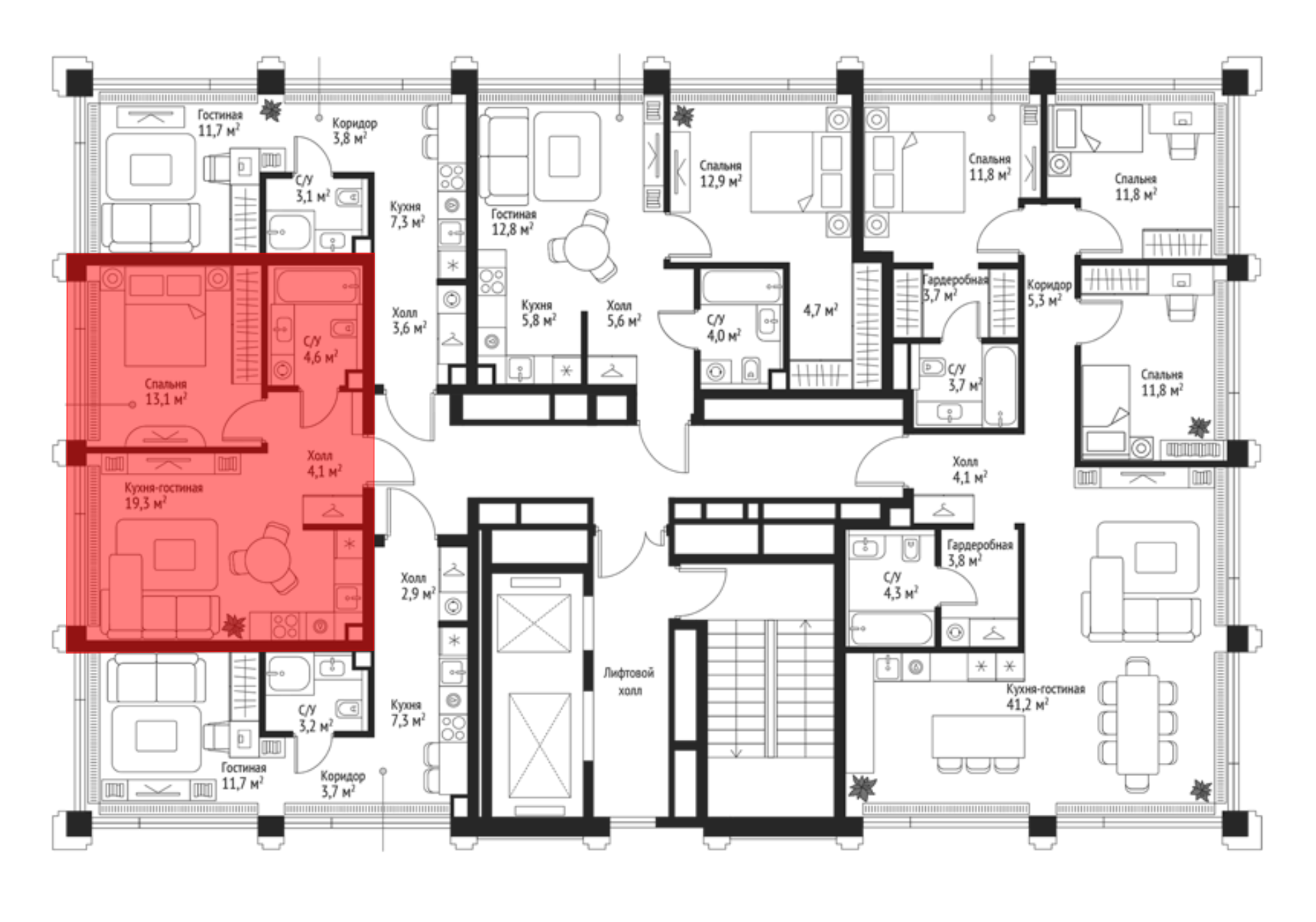 В комплексе предложен широкий выбор планировочных решений: от компактных студий площадью 22 кв. метра до просторных резиденций площадью 120 кв. метров. Планировками предусмотрены мастер-спальни с гардеробной и санузлом, просторные кухни-гостиные, гардеробные и системы хранения, выделенные рабочие зоны в спальнях и террасы с панорамным видом на город. Во всех квартирах панорамные окна и высокие потолки от 2,85 метра. Квартиры сдаются с отделкой White box.