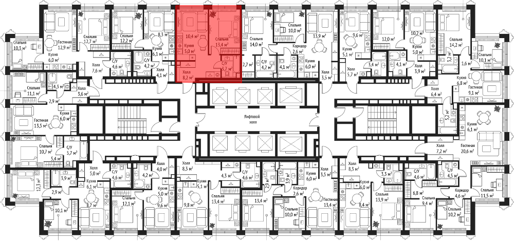 В комплексе предложен широкий выбор планировочных решений: от компактных студий площадью 22 кв. метра до просторных резиденций площадью 120 кв. метров. Планировками предусмотрены мастер-спальни с гардеробной и санузлом, просторные кухни-гостиные, гардеробные и системы хранения, выделенные рабочие зоны в спальнях и террасы с панорамным видом на город. Во всех квартирах панорамные окна и высокие потолки от 2,85 метра. Квартиры сдаются с отделкой White box.