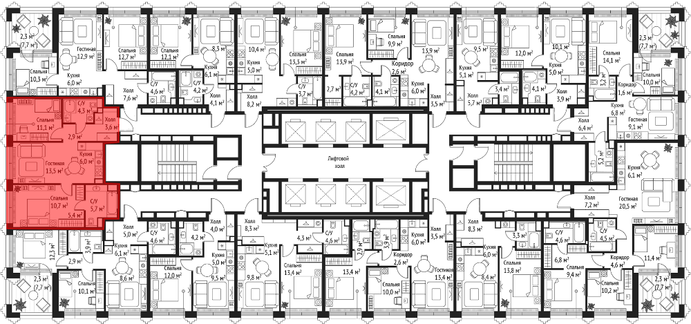 В комплексе предложен широкий выбор планировочных решений: от компактных студий площадью 22 кв. метра до просторных резиденций площадью 120 кв. метров. Планировками предусмотрены мастер-спальни с гардеробной и санузлом, просторные кухни-гостиные, гардеробные и системы хранения, выделенные рабочие зоны в спальнях и террасы с панорамным видом на город. Во всех квартирах панорамные окна и высокие потолки от 2,85 метра. Квартиры сдаются с отделкой White box.