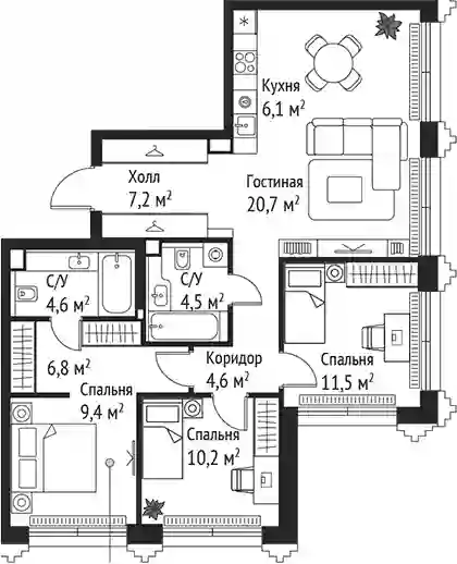 В комплексе представлены квартиры с 1–3 спальнями и таунхаусы. Квартиры сдаются с предчистовой отделкой MR BASE, что позволяет сконцентрироваться на создании интерьера под свой стиль. В квартирах установлены системы «Умная квартира» с контролем освещения и отопления, а также предусмотрена защита от протечек.