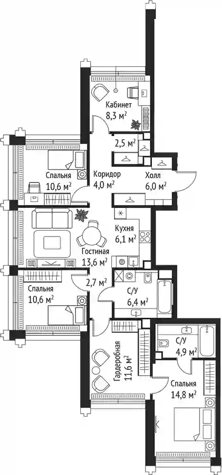 В комплексе предложен широкий выбор планировочных решений: от компактных студий площадью 22 кв. метра до просторных резиденций площадью 120 кв. метров. Планировками предусмотрены мастер-спальни с гардеробной и санузлом, просторные кухни-гостиные, гардеробные и системы хранения, выделенные рабочие зоны в спальнях и террасы с панорамным видом на город. Во всех квартирах панорамные окна и высокие потолки от 2,85 метра. Квартиры сдаются с отделкой White box.