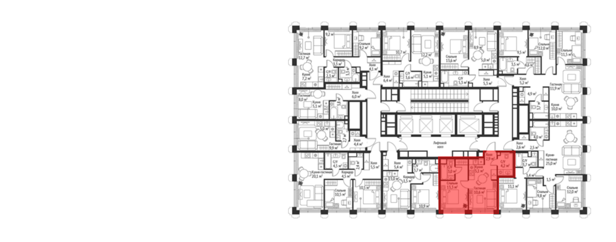 В комплексе предложен широкий выбор планировочных решений: от компактных студий площадью 22 кв. метра до просторных резиденций площадью 120 кв. метров. Планировками предусмотрены мастер-спальни с гардеробной и санузлом, просторные кухни-гостиные, гардеробные и системы хранения, выделенные рабочие зоны в спальнях и террасы с панорамным видом на город. Во всех квартирах панорамные окна и высокие потолки от 2,85 метра. Квартиры сдаются с отделкой White box.