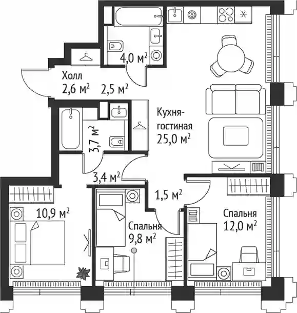 В комплексе предложен широкий выбор планировочных решений: от компактных студий площадью 22 кв. метра до просторных резиденций площадью 120 кв. метров. Планировками предусмотрены мастер-спальни с гардеробной и санузлом, просторные кухни-гостиные, гардеробные и системы хранения, выделенные рабочие зоны в спальнях и террасы с панорамным видом на город. Во всех квартирах панорамные окна и высокие потолки от 2,85 метра. Квартиры сдаются с отделкой White box.