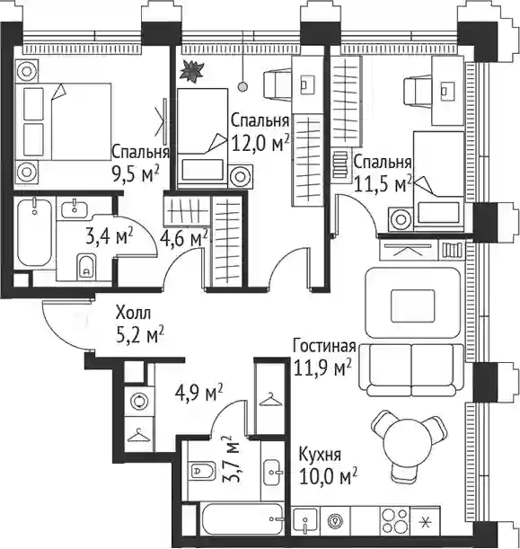 В комплексе предложен широкий выбор планировочных решений: от компактных студий площадью 22 кв. метра до просторных резиденций площадью 120 кв. метров. Планировками предусмотрены мастер-спальни с гардеробной и санузлом, просторные кухни-гостиные, гардеробные и системы хранения, выделенные рабочие зоны в спальнях и террасы с панорамным видом на город. Во всех квартирах панорамные окна и высокие потолки от 2,85 метра. Квартиры сдаются с отделкой White box.