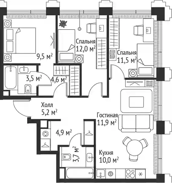 В комплексе предложен широкий выбор планировочных решений: от компактных студий площадью 22 кв. метра до просторных резиденций площадью 120 кв. метров. Планировками предусмотрены мастер-спальни с гардеробной и санузлом, просторные кухни-гостиные, гардеробные и системы хранения, выделенные рабочие зоны в спальнях и террасы с панорамным видом на город. Во всех квартирах панорамные окна и высокие потолки от 2,85 метра. Квартиры сдаются с отделкой White box.