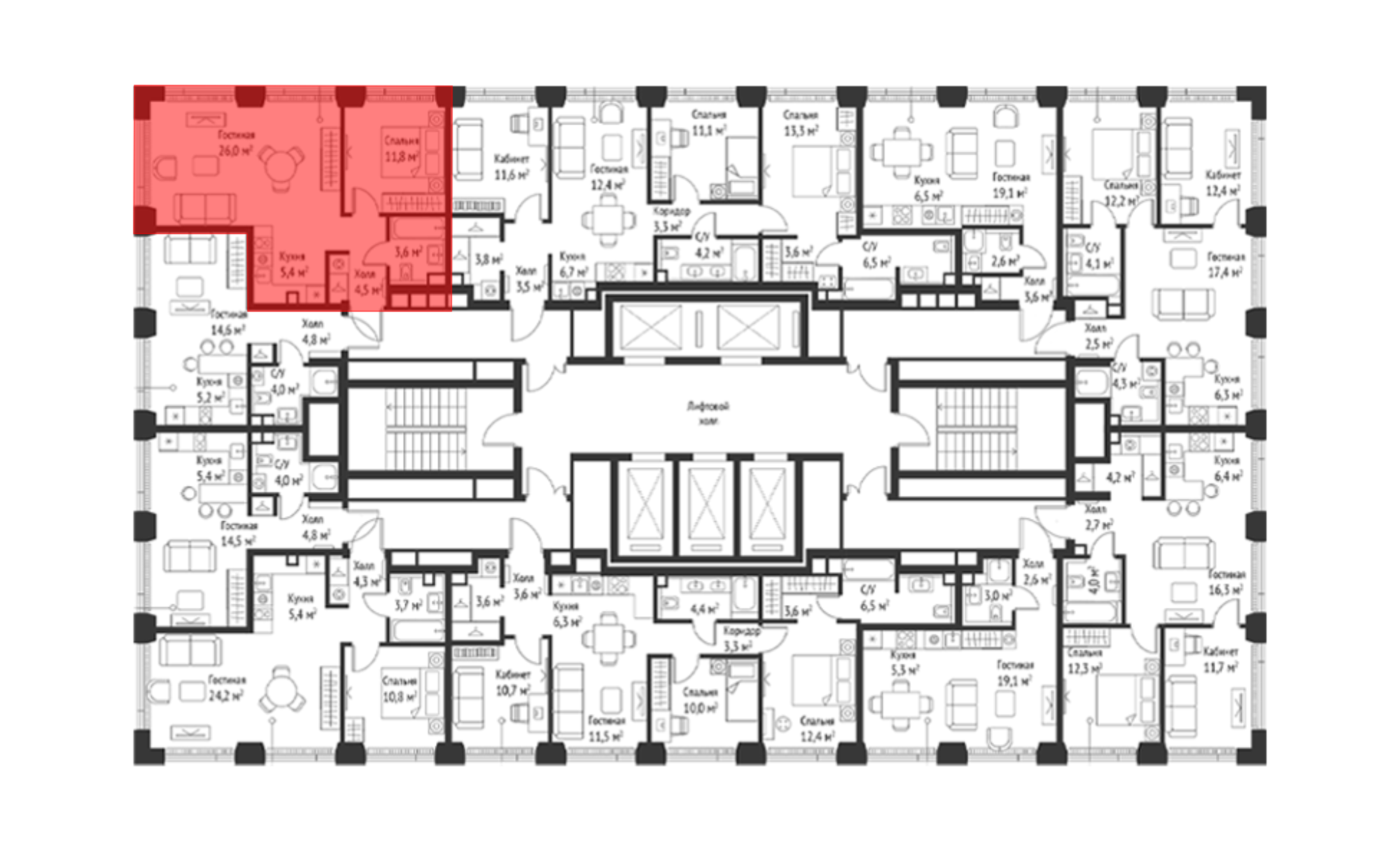 В комплексе предложен широкий выбор планировочных решений: от компактных студий площадью 22 кв. метра до просторных резиденций площадью 120 кв. метров. Планировками предусмотрены мастер-спальни с гардеробной и санузлом, просторные кухни-гостиные, гардеробные и системы хранения, выделенные рабочие зоны в спальнях и террасы с панорамным видом на город. Во всех квартирах панорамные окна и высокие потолки от 2,85 метра. Квартиры сдаются с отделкой White box.