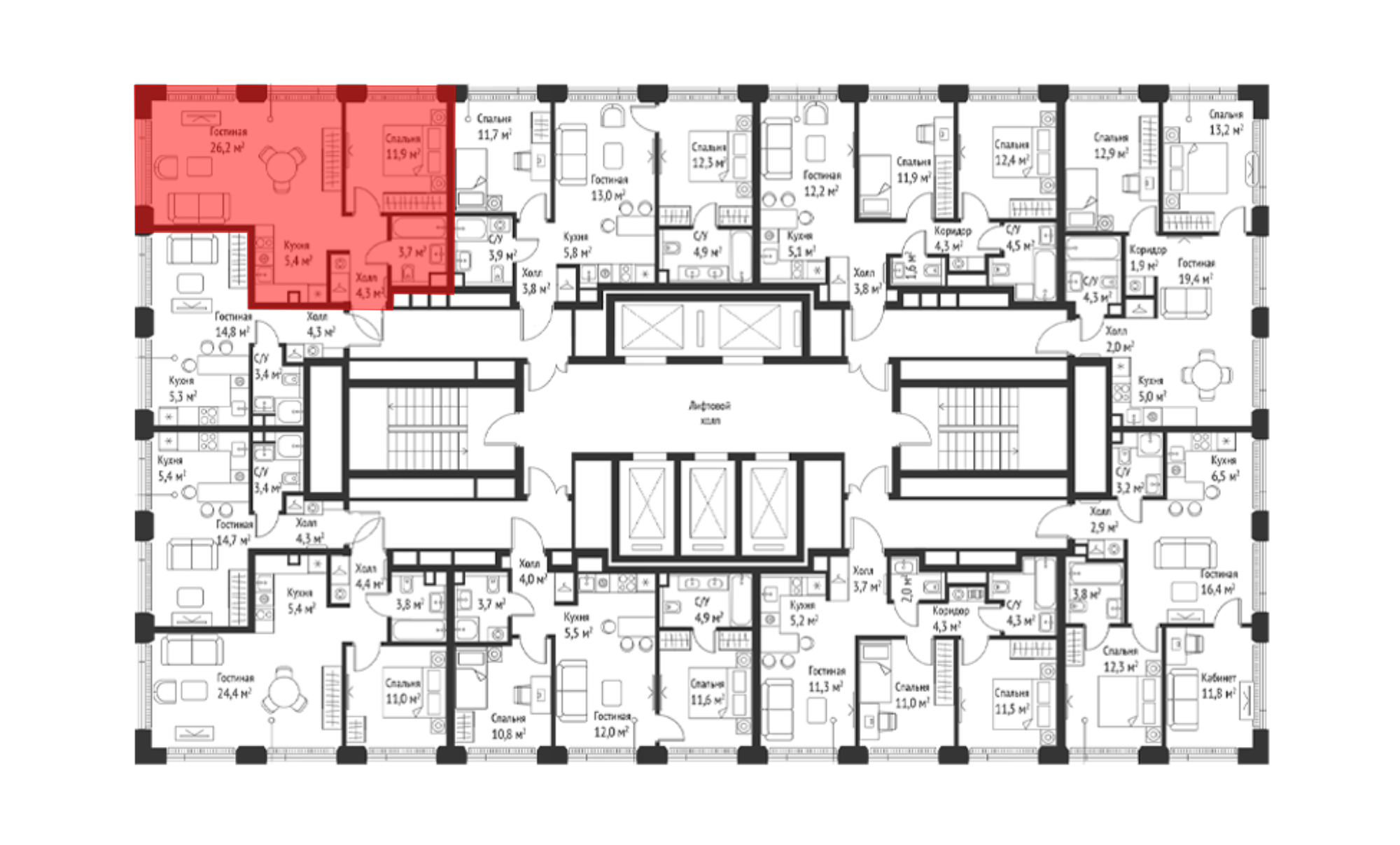 В комплексе предложен широкий выбор планировочных решений: от компактных студий площадью 22 кв. метра до просторных резиденций площадью 120 кв. метров. Планировками предусмотрены мастер-спальни с гардеробной и санузлом, просторные кухни-гостиные, гардеробные и системы хранения, выделенные рабочие зоны в спальнях и террасы с панорамным видом на город. Во всех квартирах панорамные окна и высокие потолки от 2,85 метра. Квартиры сдаются с отделкой White box.