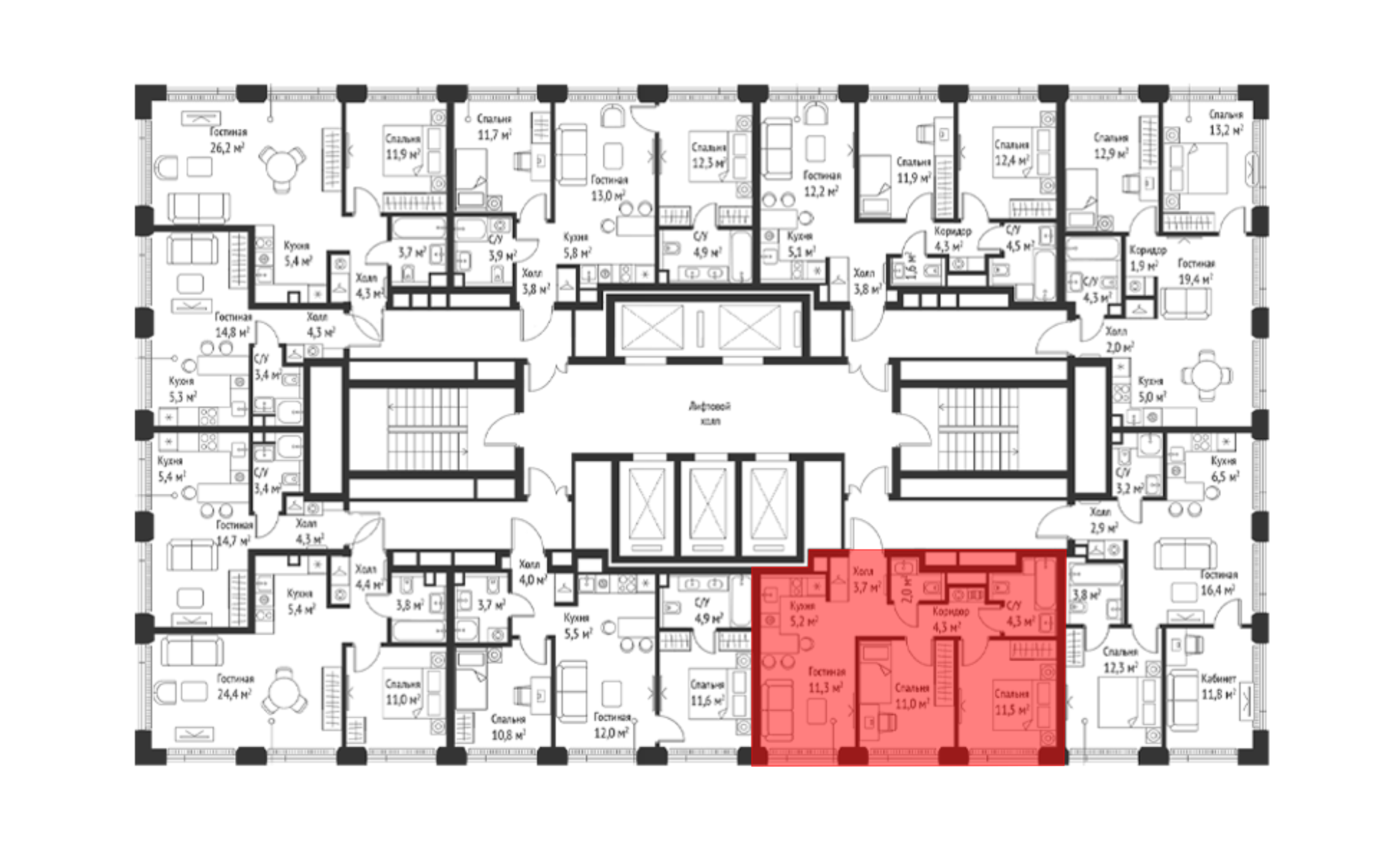 В комплексе предложен широкий выбор планировочных решений: от компактных студий площадью 22 кв. метра до просторных резиденций площадью 120 кв. метров. Планировками предусмотрены мастер-спальни с гардеробной и санузлом, просторные кухни-гостиные, гардеробные и системы хранения, выделенные рабочие зоны в спальнях и террасы с панорамным видом на город. Во всех квартирах панорамные окна и высокие потолки от 2,85 метра. Квартиры сдаются с отделкой White box.