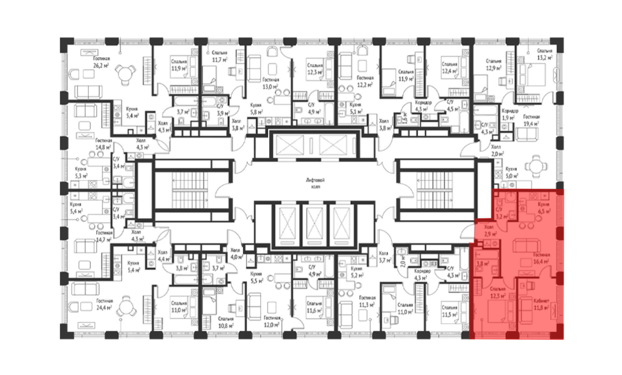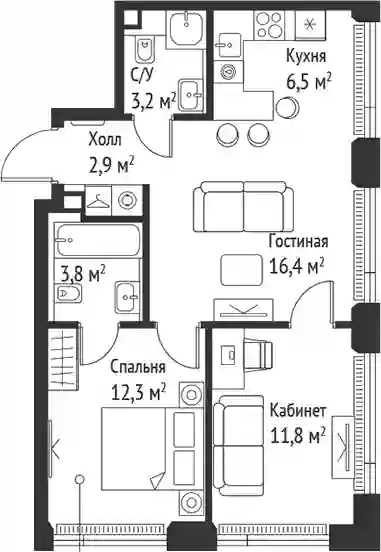 В комплексе предложен широкий выбор планировочных решений: от компактных студий площадью 22 кв. метра до просторных резиденций площадью 120 кв. метров. Планировками предусмотрены мастер-спальни с гардеробной и санузлом, просторные кухни-гостиные, гардеробные и системы хранения, выделенные рабочие зоны в спальнях и террасы с панорамным видом на город. Во всех квартирах панорамные окна и высокие потолки от 2,85 метра. Квартиры сдаются с отделкой White box.