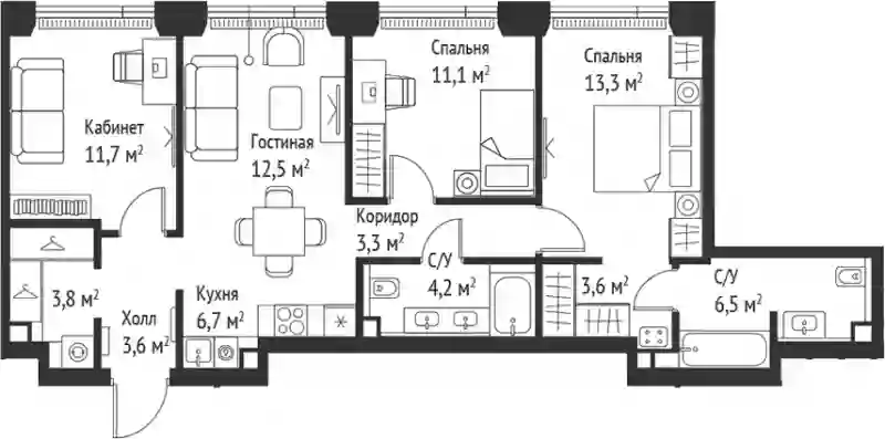 В комплексе представлены квартиры с 1–3 спальнями и таунхаусы. Квартиры сдаются с предчистовой отделкой MR BASE, что позволяет сконцентрироваться на создании интерьера под свой стиль. В квартирах установлены системы «Умная квартира» с контролем освещения и отопления, а также предусмотрена защита от протечек.