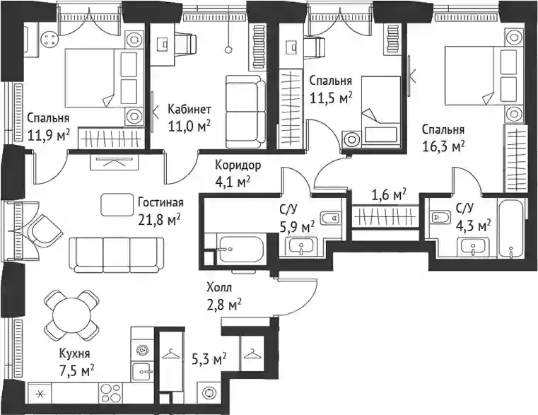 В комплексе предложен широкий выбор планировочных решений: от компактных студий площадью 22 кв. метра до просторных резиденций площадью 120 кв. метров. Планировками предусмотрены мастер-спальни с гардеробной и санузлом, просторные кухни-гостиные, гардеробные и системы хранения, выделенные рабочие зоны в спальнях и террасы с панорамным видом на город. Во всех квартирах панорамные окна и высокие потолки от 2,85 метра. Квартиры сдаются с отделкой White box.