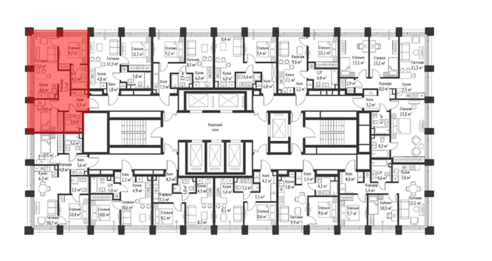 В комплексе предложен широкий выбор планировочных решений: от компактных студий площадью 22 кв. метра до просторных резиденций площадью 120 кв. метров. Планировками предусмотрены мастер-спальни с гардеробной и санузлом, просторные кухни-гостиные, гардеробные и системы хранения, выделенные рабочие зоны в спальнях и террасы с панорамным видом на город. Во всех квартирах панорамные окна и высокие потолки от 2,85 метра. Квартиры сдаются с отделкой White box.