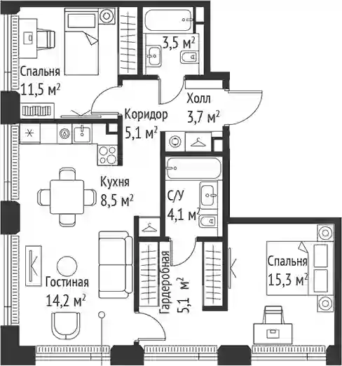 В комплексе предложен широкий выбор планировочных решений: от компактных студий площадью 22 кв. метра до просторных резиденций площадью 120 кв. метров. Планировками предусмотрены мастер-спальни с гардеробной и санузлом, просторные кухни-гостиные, гардеробные и системы хранения, выделенные рабочие зоны в спальнях и террасы с панорамным видом на город. Во всех квартирах панорамные окна и высокие потолки от 2,85 метра. Квартиры сдаются с отделкой White box.