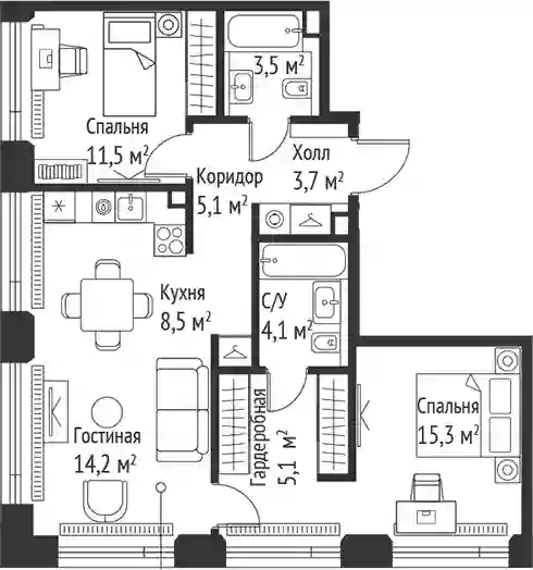 В комплексе предложен широкий выбор планировочных решений: от компактных студий площадью 22 кв. метра до просторных резиденций площадью 120 кв. метров. Планировками предусмотрены мастер-спальни с гардеробной и санузлом, просторные кухни-гостиные, гардеробные и системы хранения, выделенные рабочие зоны в спальнях и террасы с панорамным видом на город. Во всех квартирах панорамные окна и высокие потолки от 2,85 метра. Квартиры сдаются с отделкой White box.