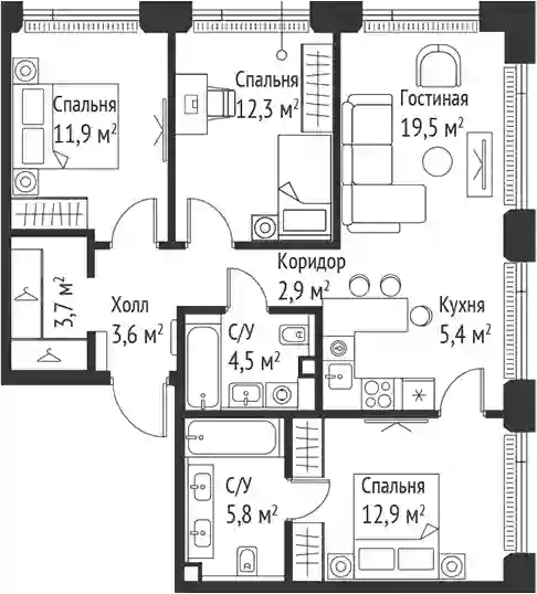 Квартиры в ЖК представлены классическими планировками от студий до трёхкомнатных. Есть возможность выбрать квартиру без отделки, с подчистовой и чистовой отделкой.