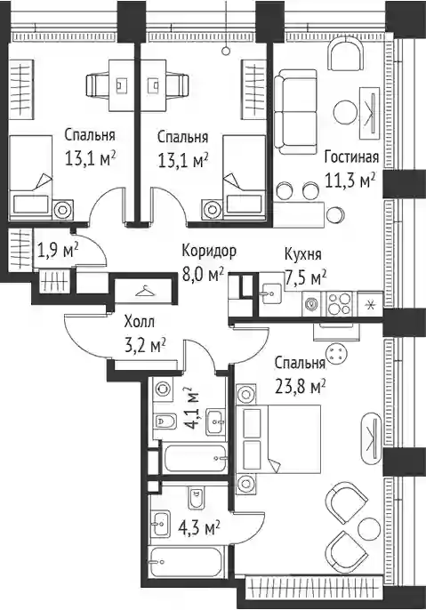 В комплексе предложено множество планировочных решений: в наличии квартиры, как классического типа, так и европланировки. Квартиры сдаются с подчистовой отделкой, высотой потолков 3 м и панорамным остеклением в пол.
