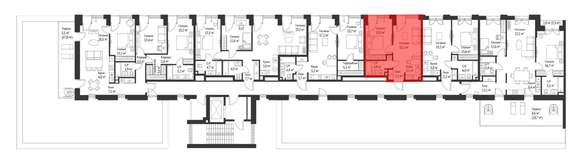 В комплексе предложен широкий выбор планировочных решений: от компактных студий площадью 22 кв. метра до просторных резиденций площадью 120 кв. метров. Планировками предусмотрены мастер-спальни с гардеробной и санузлом, просторные кухни-гостиные, гардеробные и системы хранения, выделенные рабочие зоны в спальнях и террасы с панорамным видом на город. Во всех квартирах панорамные окна и высокие потолки от 2,85 метра. Квартиры сдаются с отделкой White box.