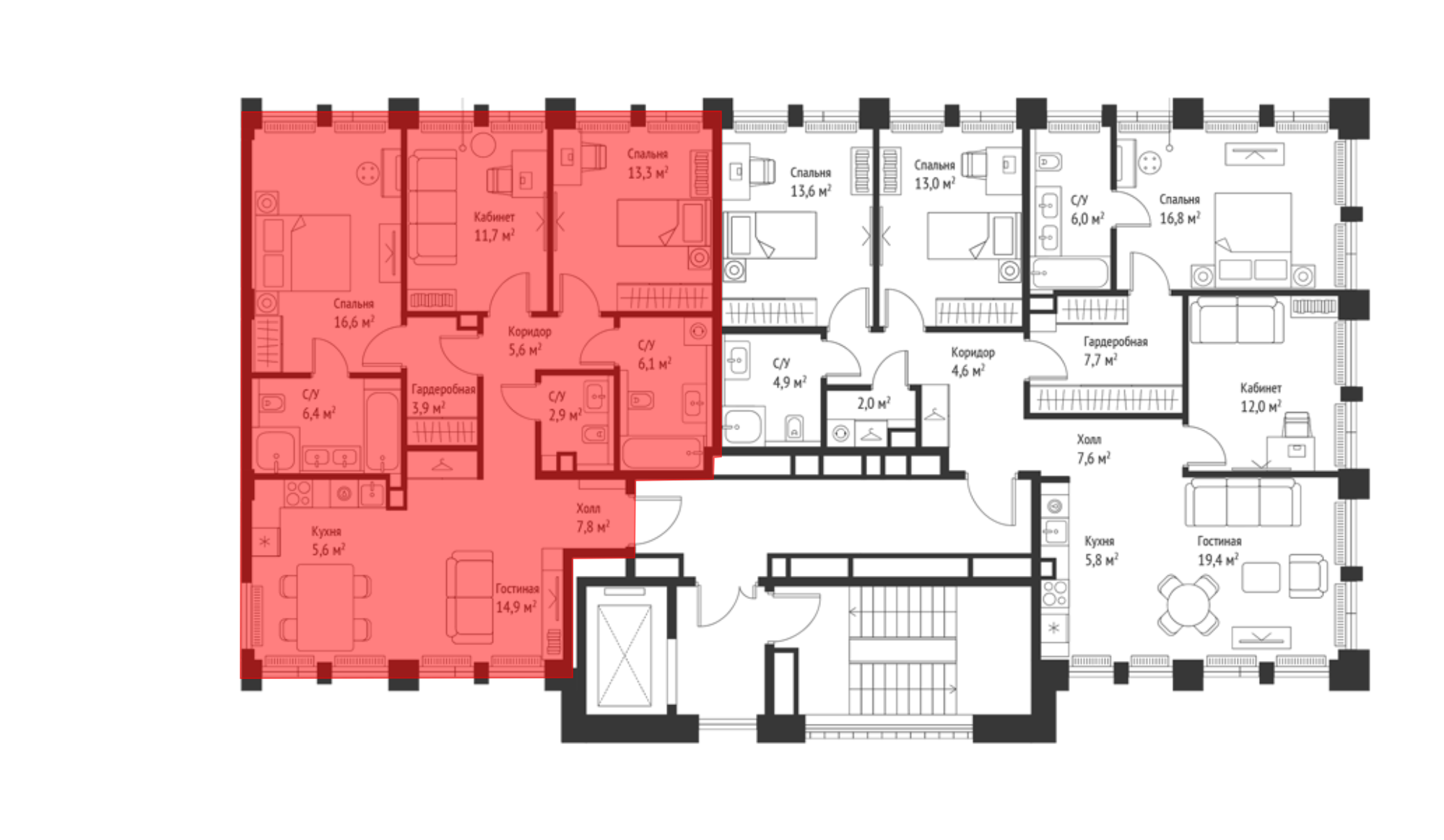 В комплексе предложен широкий выбор планировочных решений: от компактных студий площадью 22 кв. метра до просторных резиденций площадью 120 кв. метров. Планировками предусмотрены мастер-спальни с гардеробной и санузлом, просторные кухни-гостиные, гардеробные и системы хранения, выделенные рабочие зоны в спальнях и террасы с панорамным видом на город. Во всех квартирах панорамные окна и высокие потолки от 2,85 метра. Квартиры сдаются с отделкой White box.