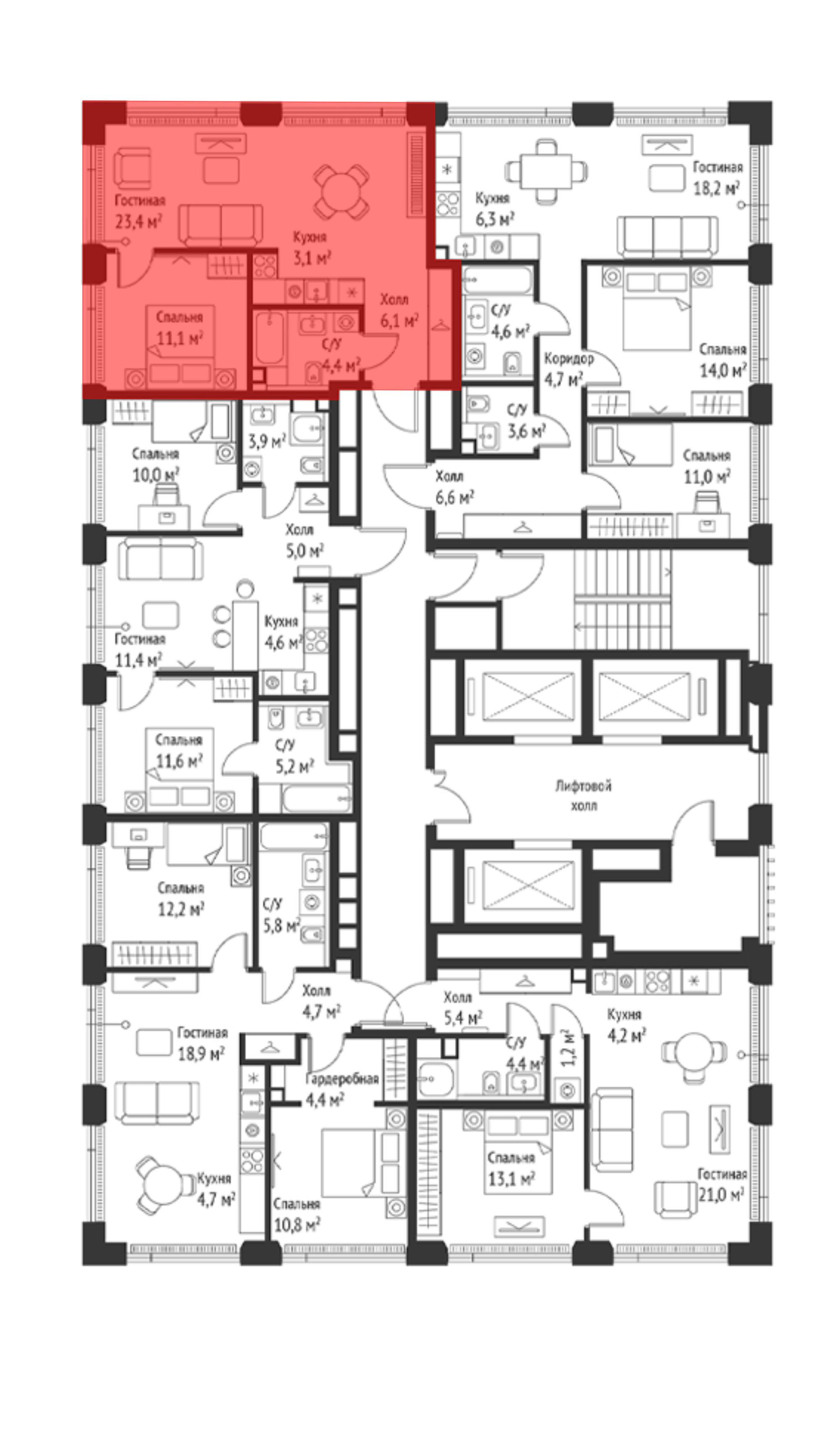 В комплексе предложен широкий выбор планировочных решений: от компактных студий площадью 22 кв. метра до просторных резиденций площадью 120 кв. метров. Планировками предусмотрены мастер-спальни с гардеробной и санузлом, просторные кухни-гостиные, гардеробные и системы хранения, выделенные рабочие зоны в спальнях и террасы с панорамным видом на город. Во всех квартирах панорамные окна и высокие потолки от 2,85 метра. Квартиры сдаются с отделкой White box.