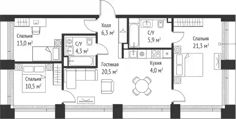 Планировочные решения включают как классические форматы, так и европланировки. Квартиры сдаются без отделки, с потолками высотой 3,1 метра и увеличенной площадью остекления. В некоторых квартирах предусмотрены просторные террасы.