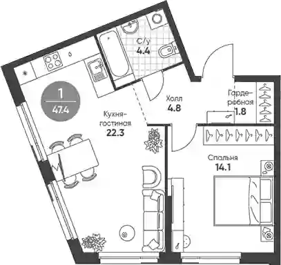 25 817 446 ₽2-к.квартира, 43.2 м², 14 эт.