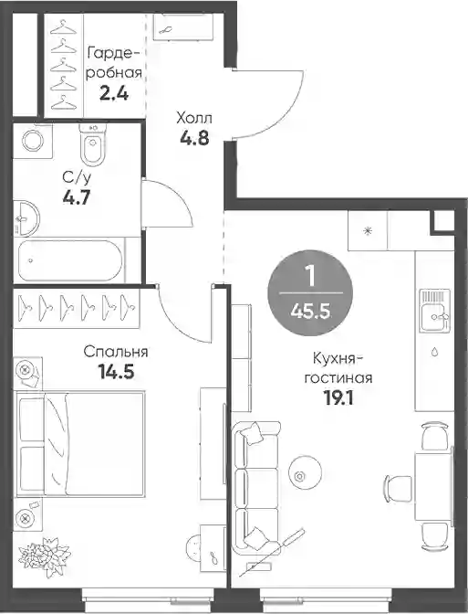 24 241 118 ₽2-к.квартира, 42.1 м², 2 эт.