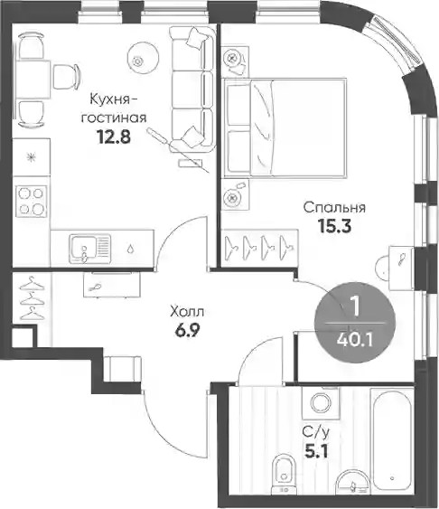 25 401 477 ₽1-к.квартира, 38.9 м², 6 эт.