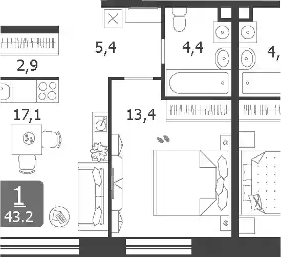 29 860 472 ₽2-к.квартира, 43.2 м², 19 эт.